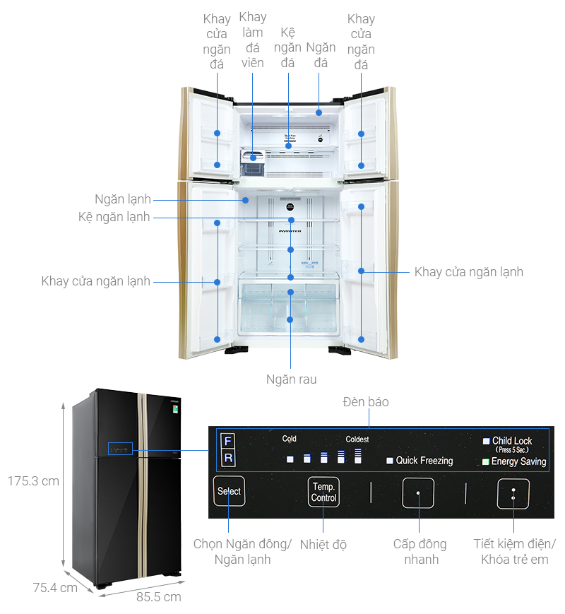 - Kiểu tủ Multi Door - 4 cánh rộng rãi, ngăn đá bên trên dễ dàng sử dụng, lưu trữ thực phẩm.