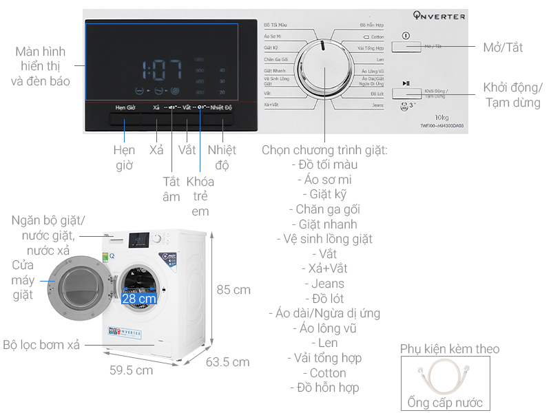 Máy giặt TCL Inverter 10 Kg TWF100-M14303DA03 được tích hợp núm xoay tiện lợi cùng màn hình LED với bảng điều khiển bằng tiếng Việt giúp người sử dụng dễ dàng lựa chọn chương trình giặt mình mong muốn. Máy còn được tích hợp 16 chương trình giặt đa dạng bao gồm: giặt nhanh, áo dài/ngừa dị ứng, giặt kỹ, len, đồ tối màu, áo sơ mi, cotton, vệ sinh lồng giặt... (Xem thêm tại bảng TSKT). Trong đó có chương trình giặt Áo dài/Ngừa dị ứng sẽ loại bỏ những tác nhân gây dị ứng như bụi bẩn, vi khuẩn giúp quần áo sạch sẽ không gây ngứa cho người mặc.
